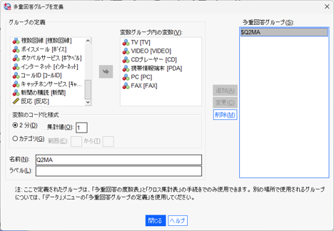 出来たら真ん中の「追加」ボタンを押し、「多重回答グループ」に追加されたら「閉じる」を押してください。