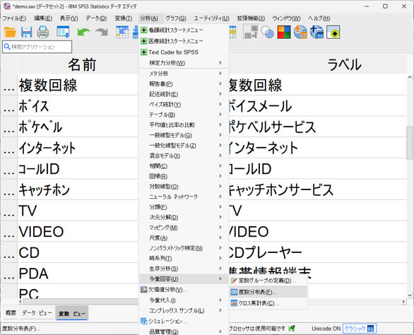 メニューから [分析]→[多重回答]→[度数分布表] を選択