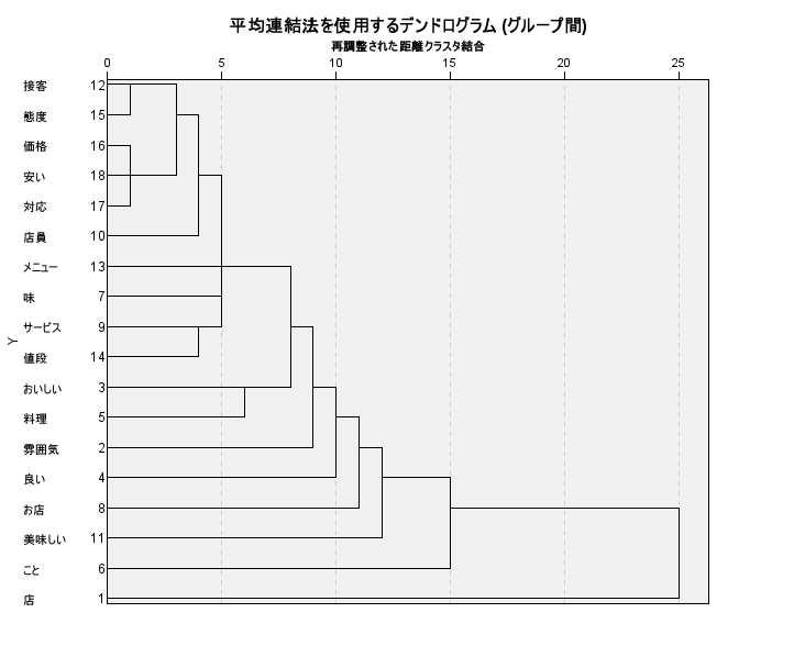 デンドログラムを用いて、意味的に近い語群を自動グルーピング。